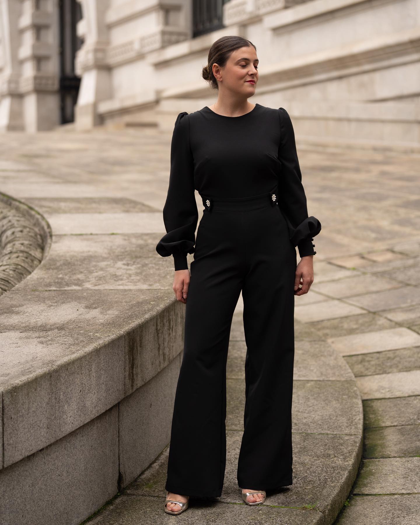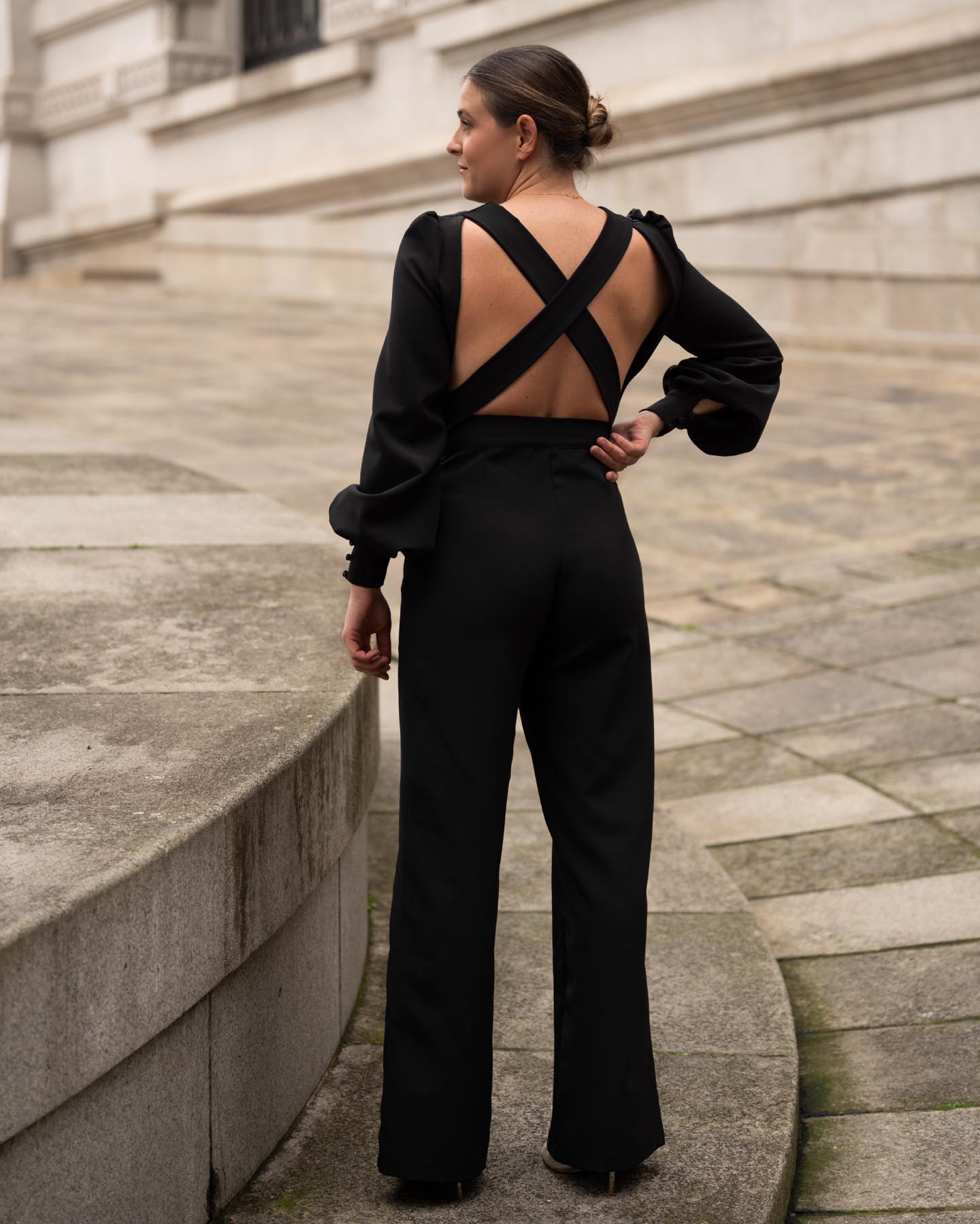 Mono largo de fiesta confeccionado en tejido de calidad con manga larga y cierre de cremallera. Destaca por su espalda cruzada de diseño elegante y botones de joya que añaden un toque de sofisticación. Prenda versátil perfecta para eventos especiales, cócteles y celebraciones donde desees lucir impecable y diferente.