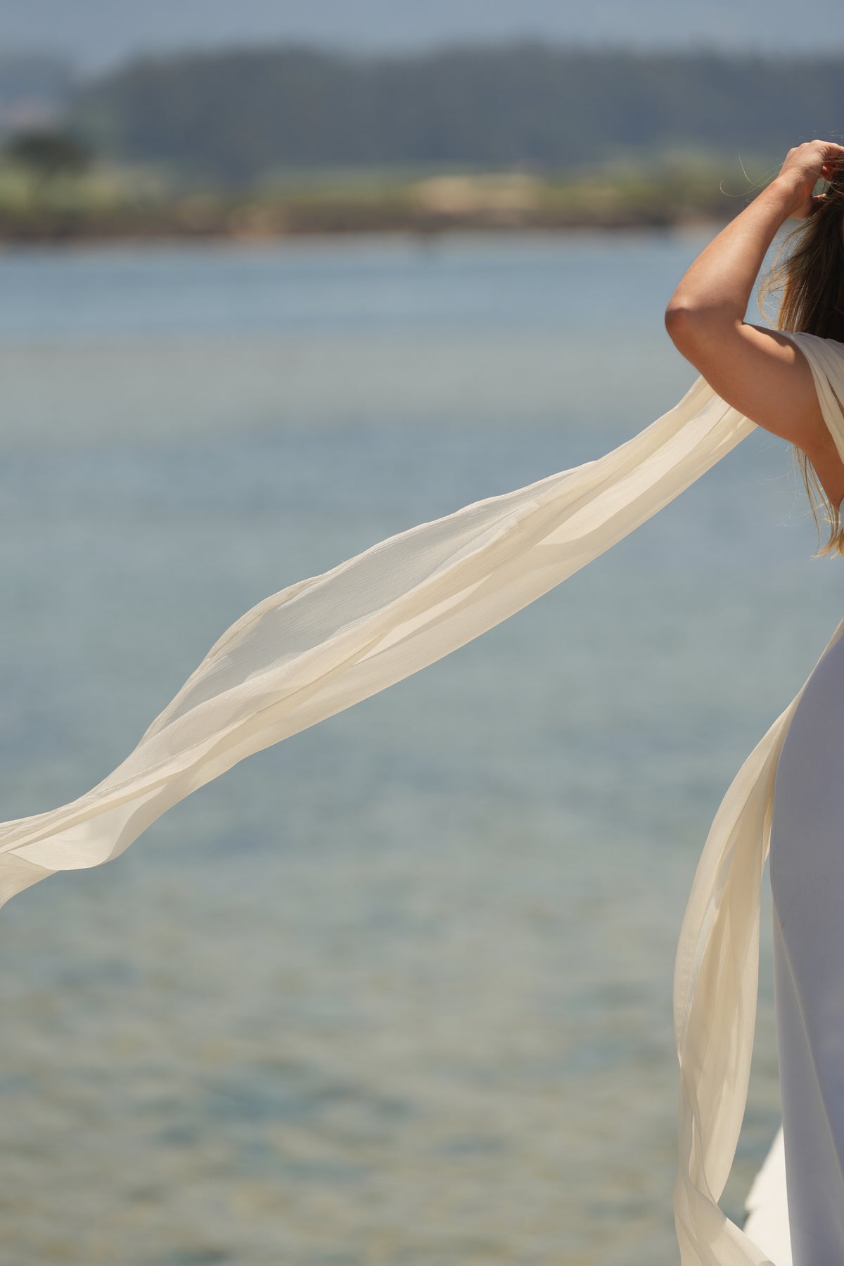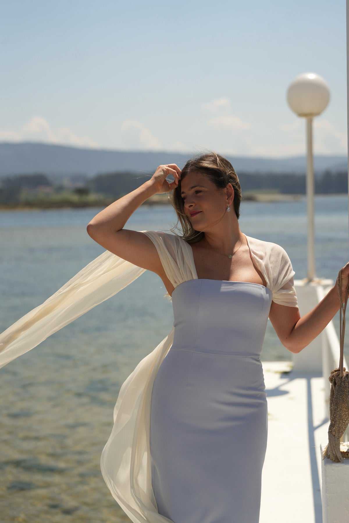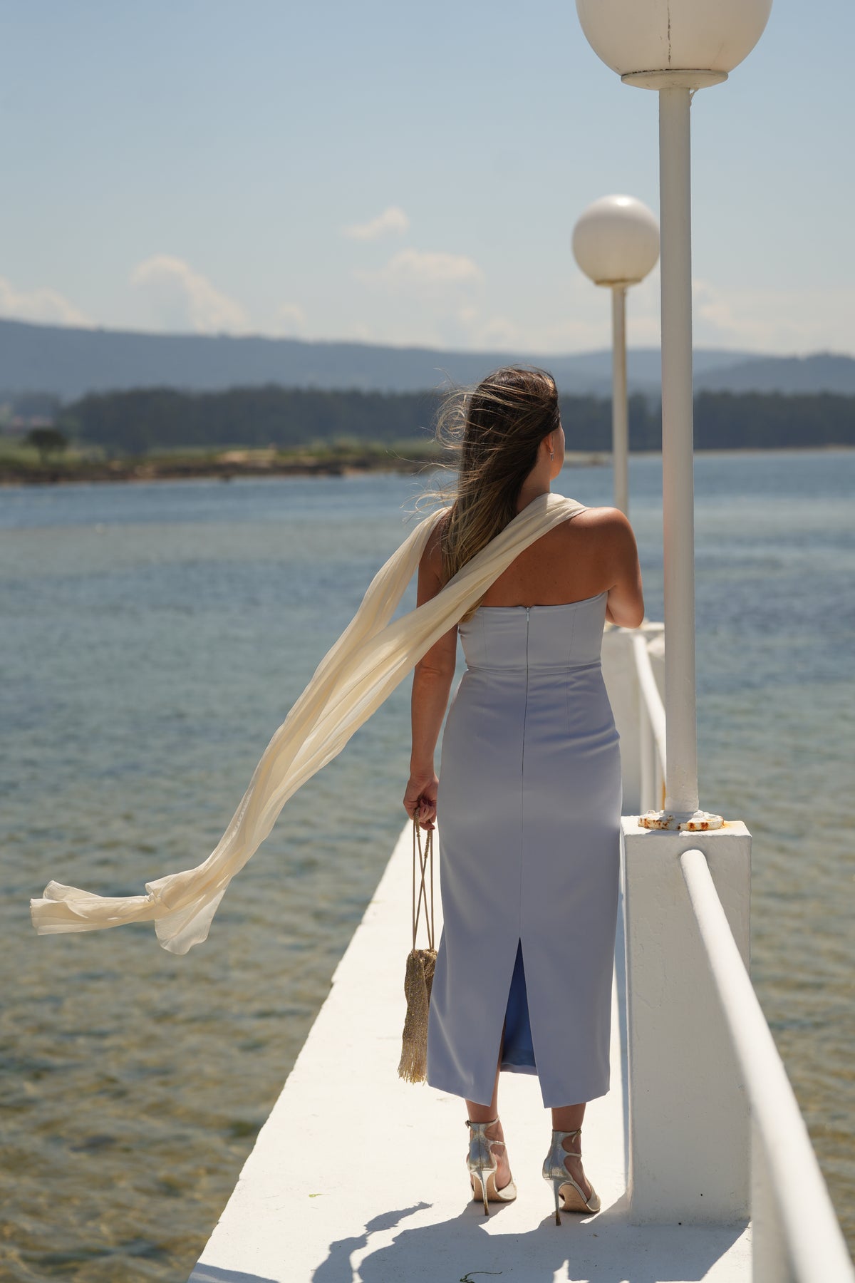Vestido de tubo con corte en la cintura, escote palabra de honor. Lleva dos tirantes  semitransparentes con un ligero brillo, se sujetan en la parte delantera y van sueltos en la parte de atras para dar un efecto vaporoso.
