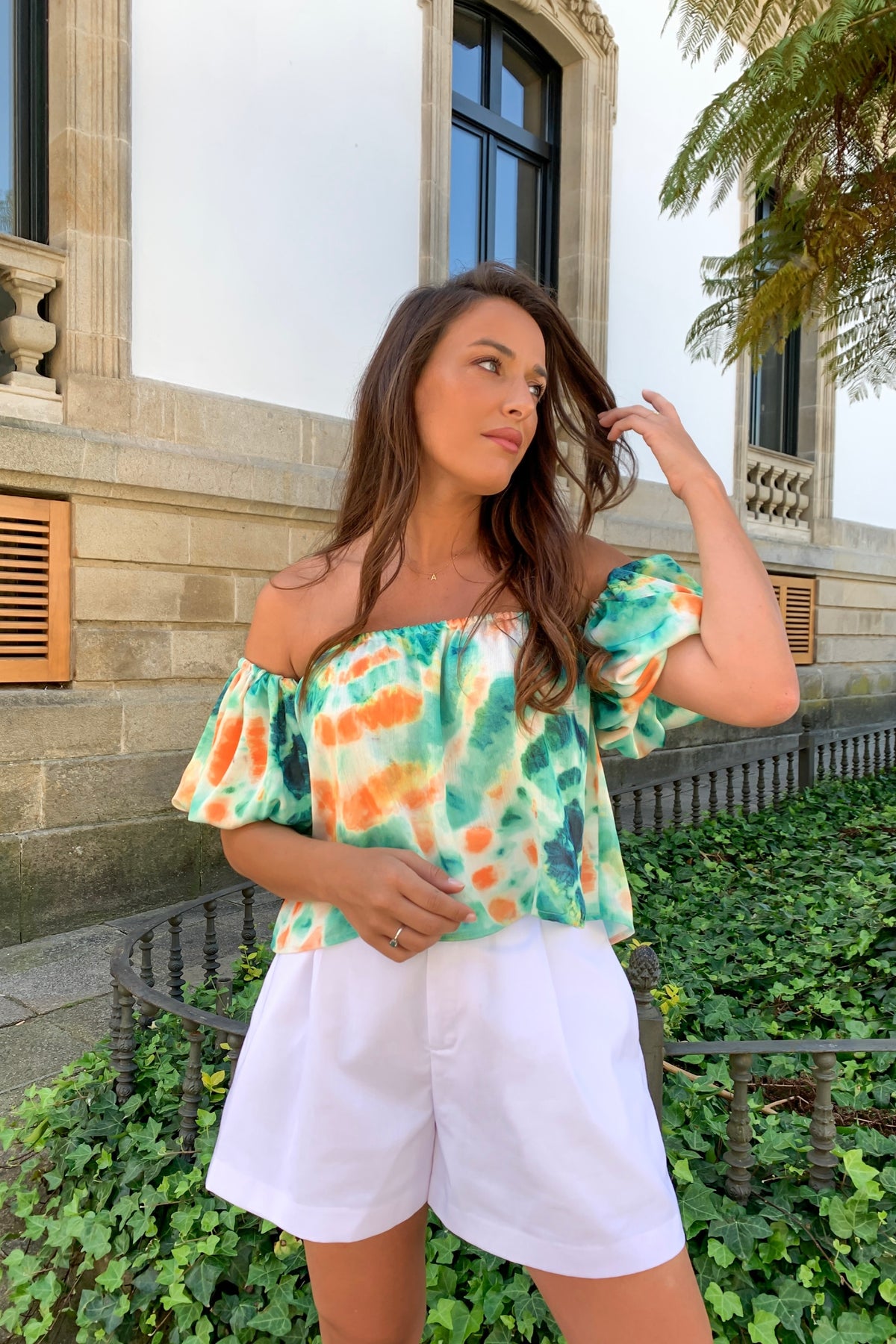 Short de cintura alta con bolsillos laterales, cierre frontal de cremallera y botón forrado, pinzas en la parte frontal que crean un efecto mas suelto en la pierna.
