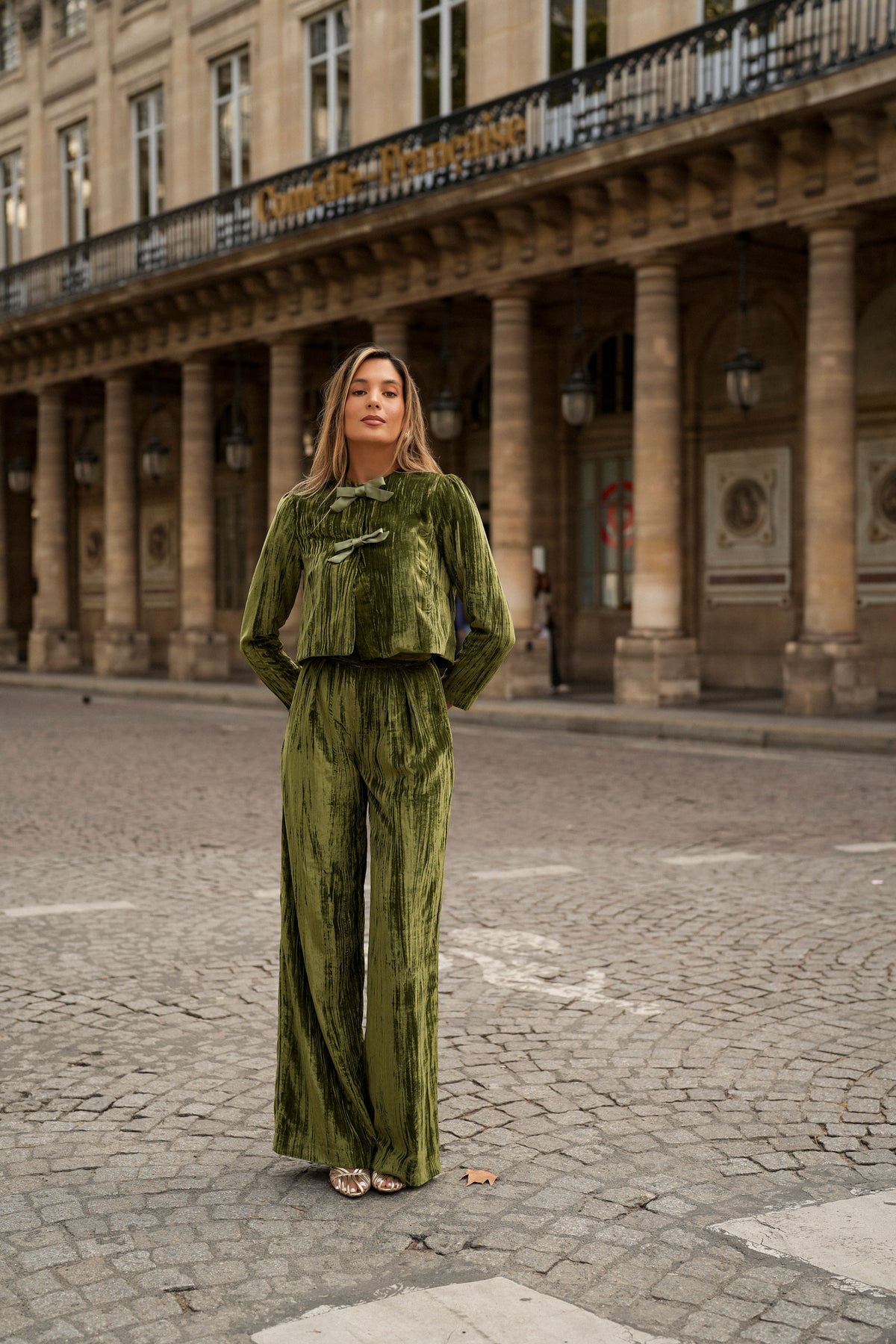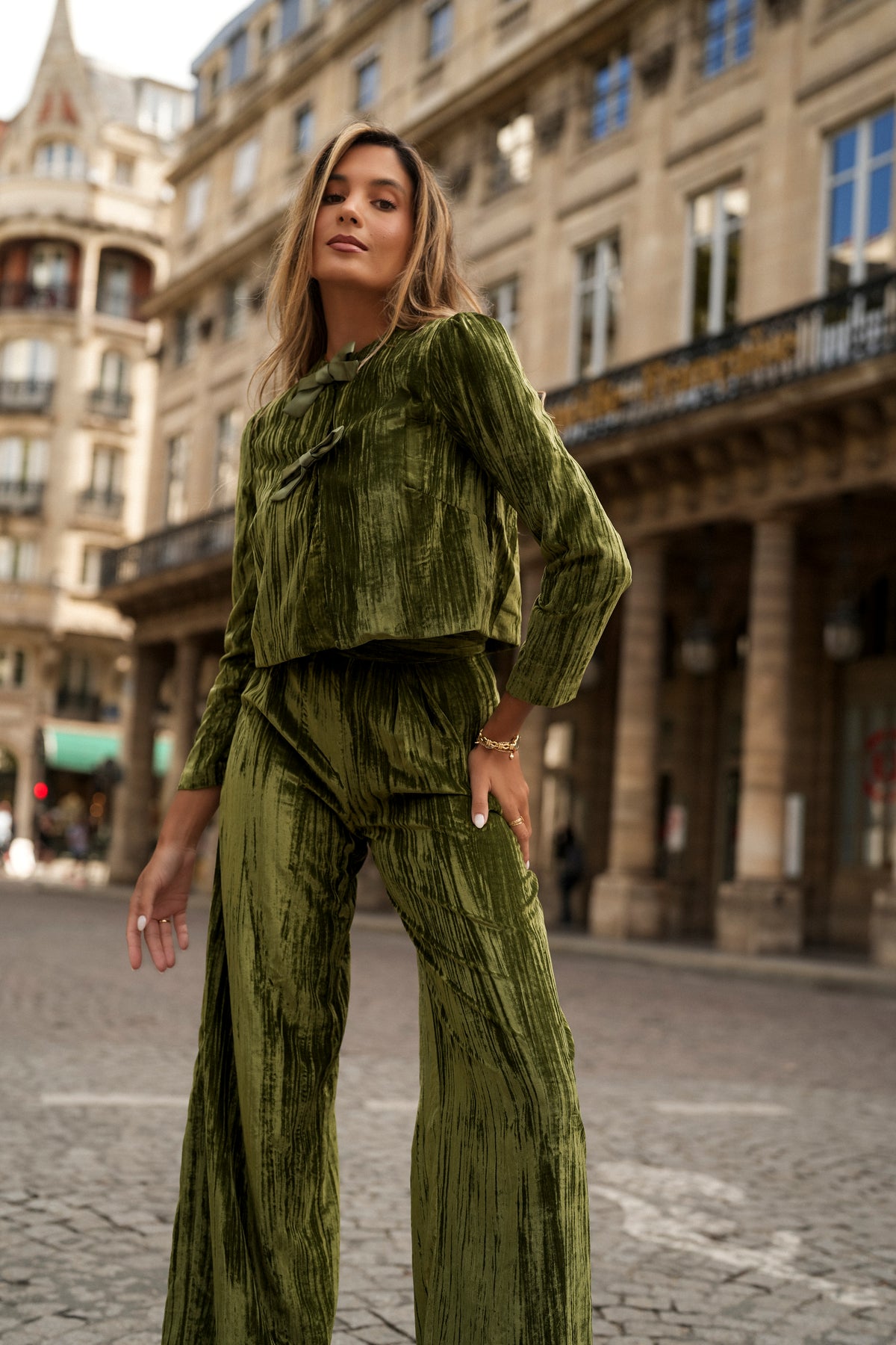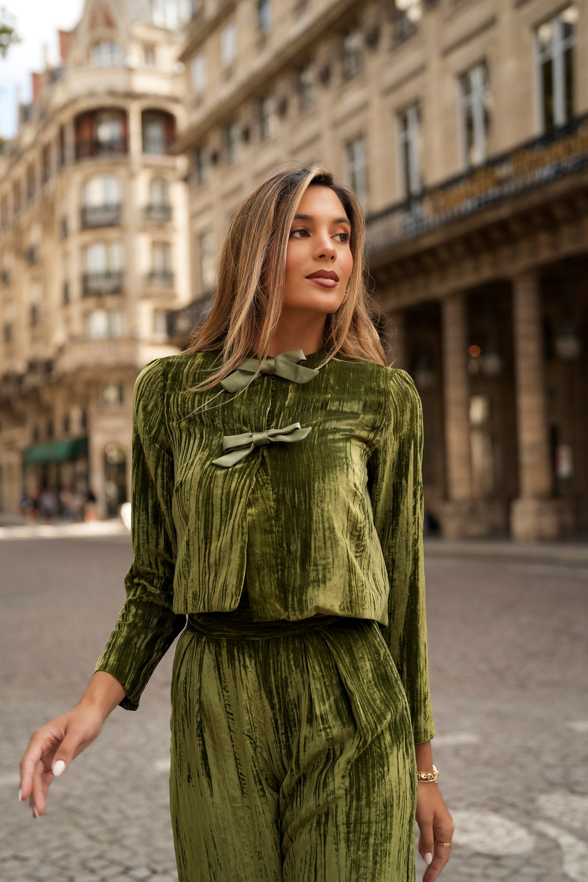 This velvet set is the definition of elegance and sophistication. Featuring high-waisted long pants and a matching jacket featuring two satin bows at the top, this set is perfect for any occasion. Whether worn alone or layered under the jacket, this set is a luxurious and unique addition to any fashion wardrobe.