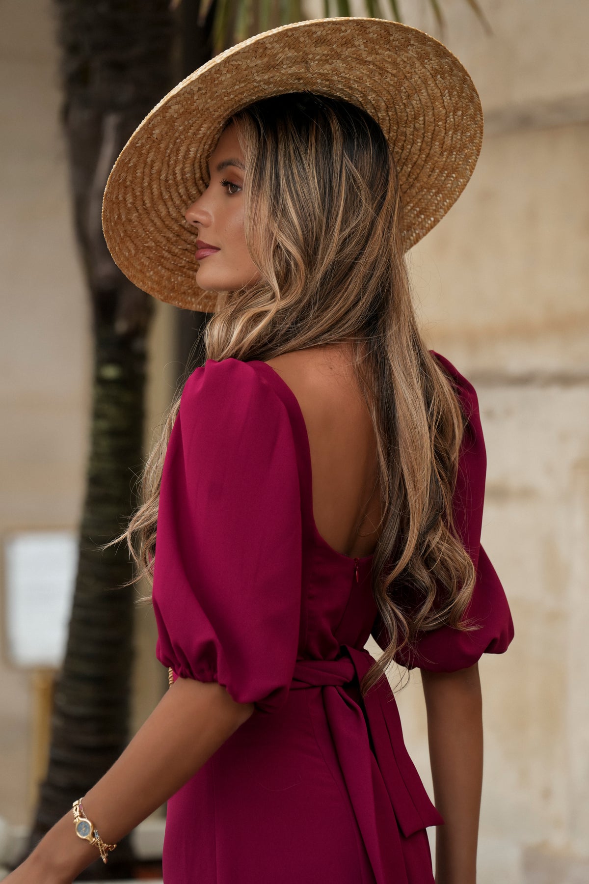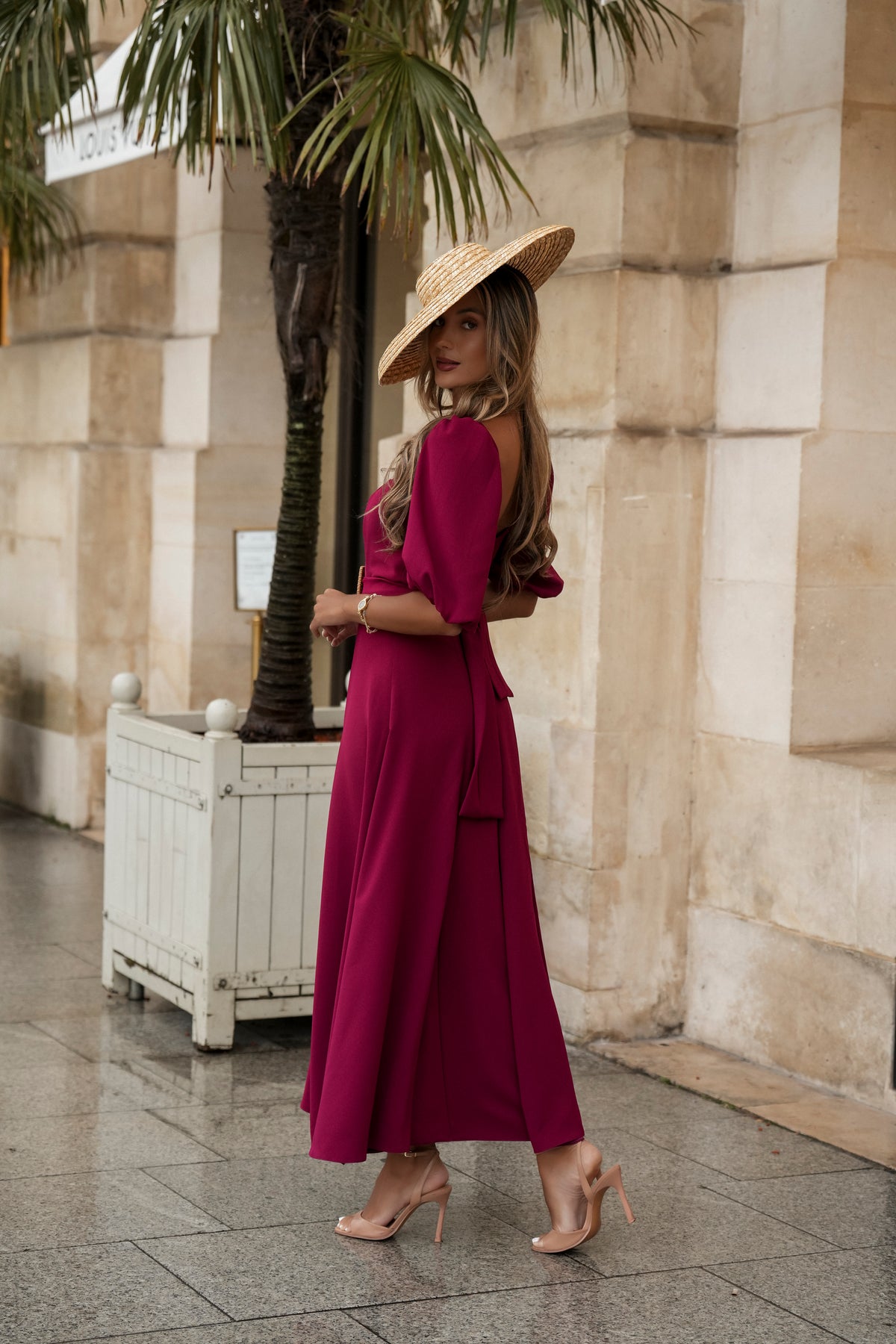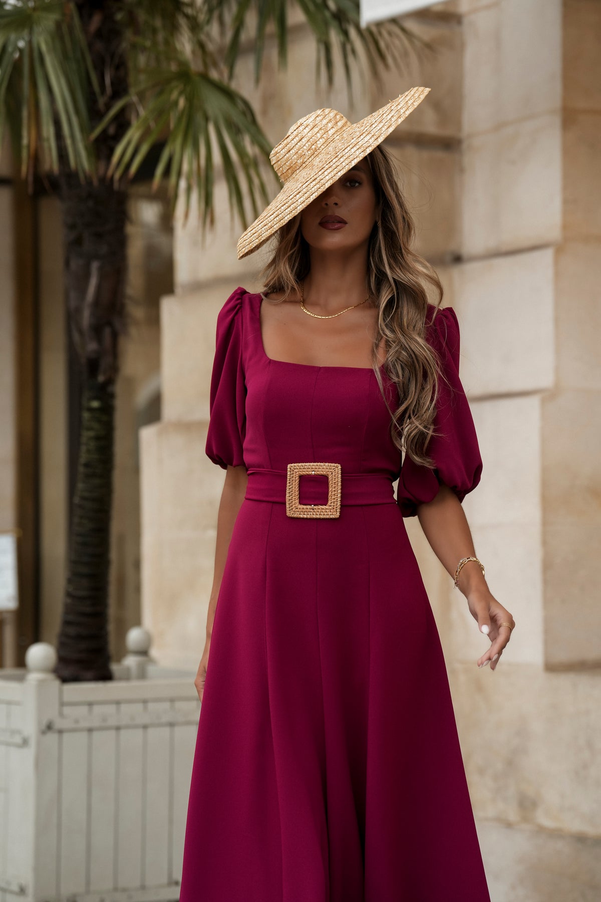 A midi design that combines romance and elegance in every detail. With a square neckline and puffed sleeves that add volume and delicacy, it is fitted at the waist with a buckled belt that enhances the silhouette. The full skirt provides movement and lightness, making it an ideal choice for standing out at any event with a sophisticated and feminine style. Fully lined. Back zipper closure. Includes a raffia buckled belt secured with a bow.