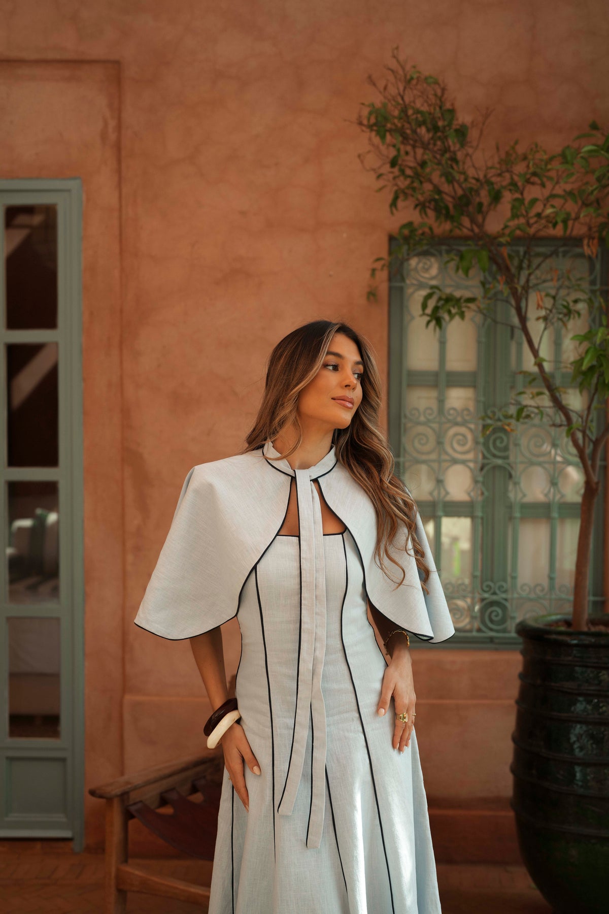 A linen cape with a lining, designed to complement the Flora collection. Available in coordinating colors to create harmonious and versatile outfits. Its elegant structure and quality material make it a versatile wardrobe staple, perfect for seasonal transitions and a variety of occasions.