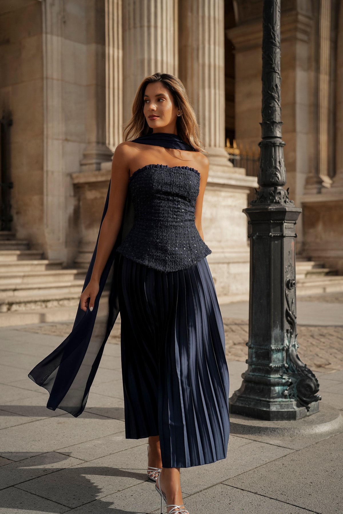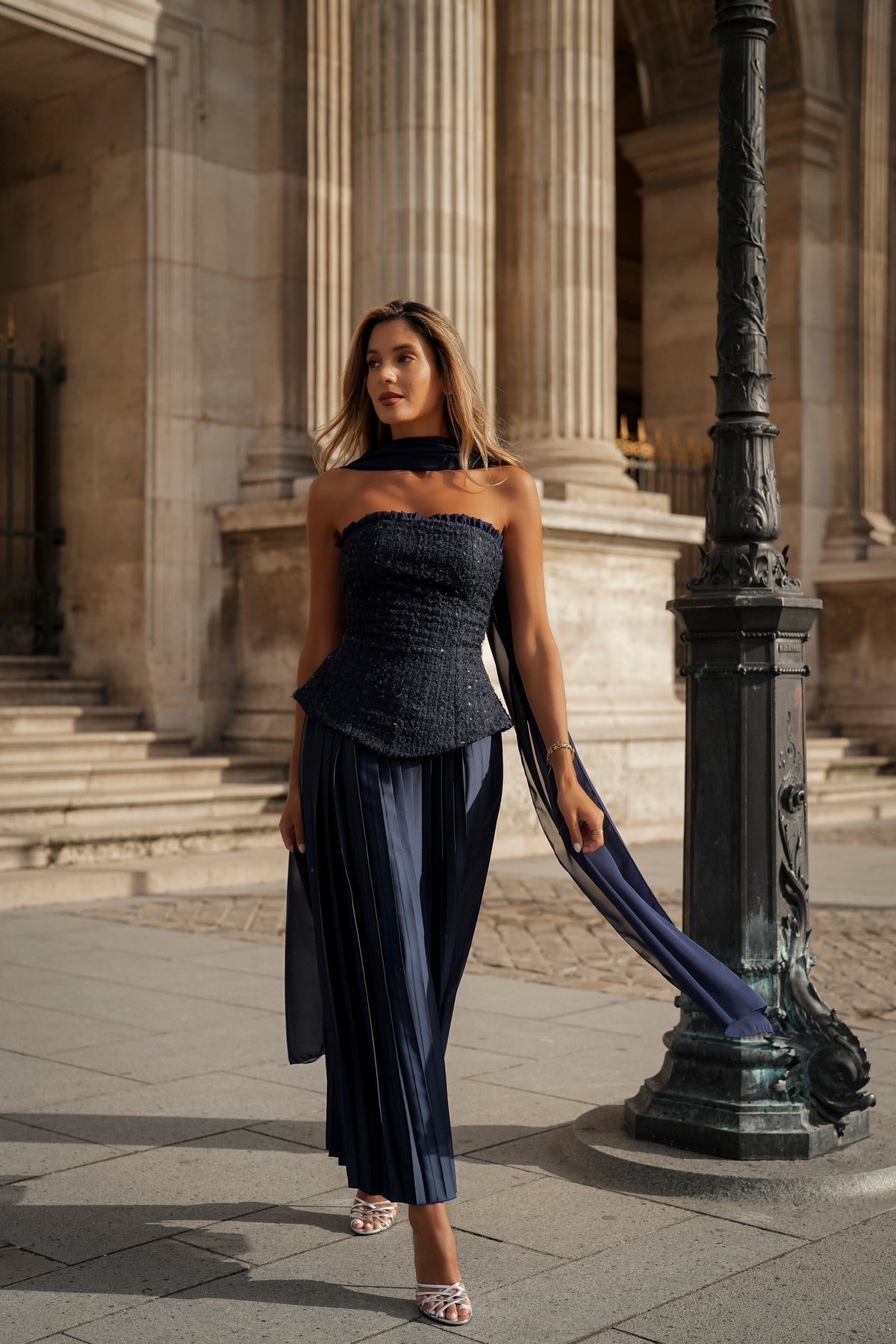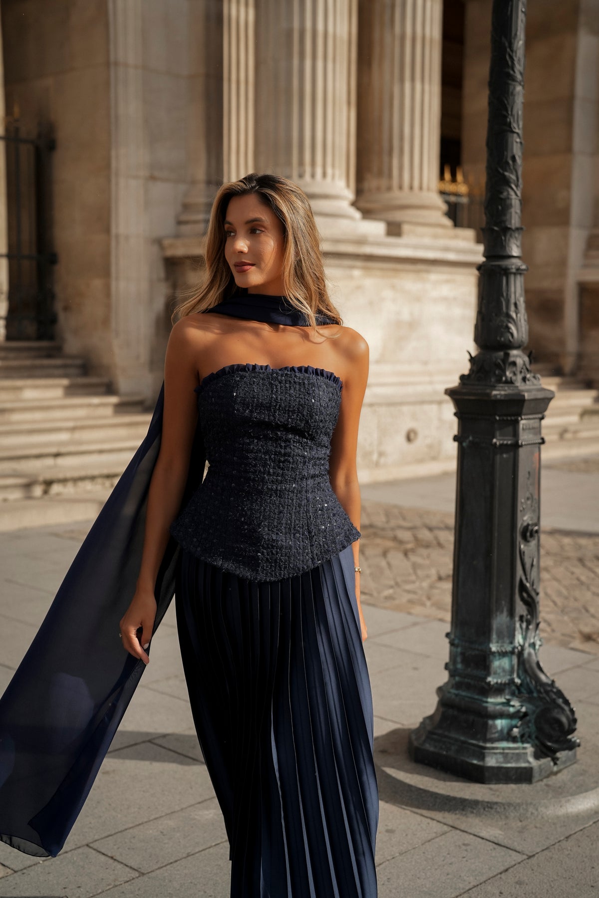 A two-piece set that combines the structure of a textured fitted top with the fluidity of a pleated skirt. The harmony between the two pieces creates a sophisticated and contemporary look, designed to shine at special events with a feminine and delicate touch, like a flower in motion.