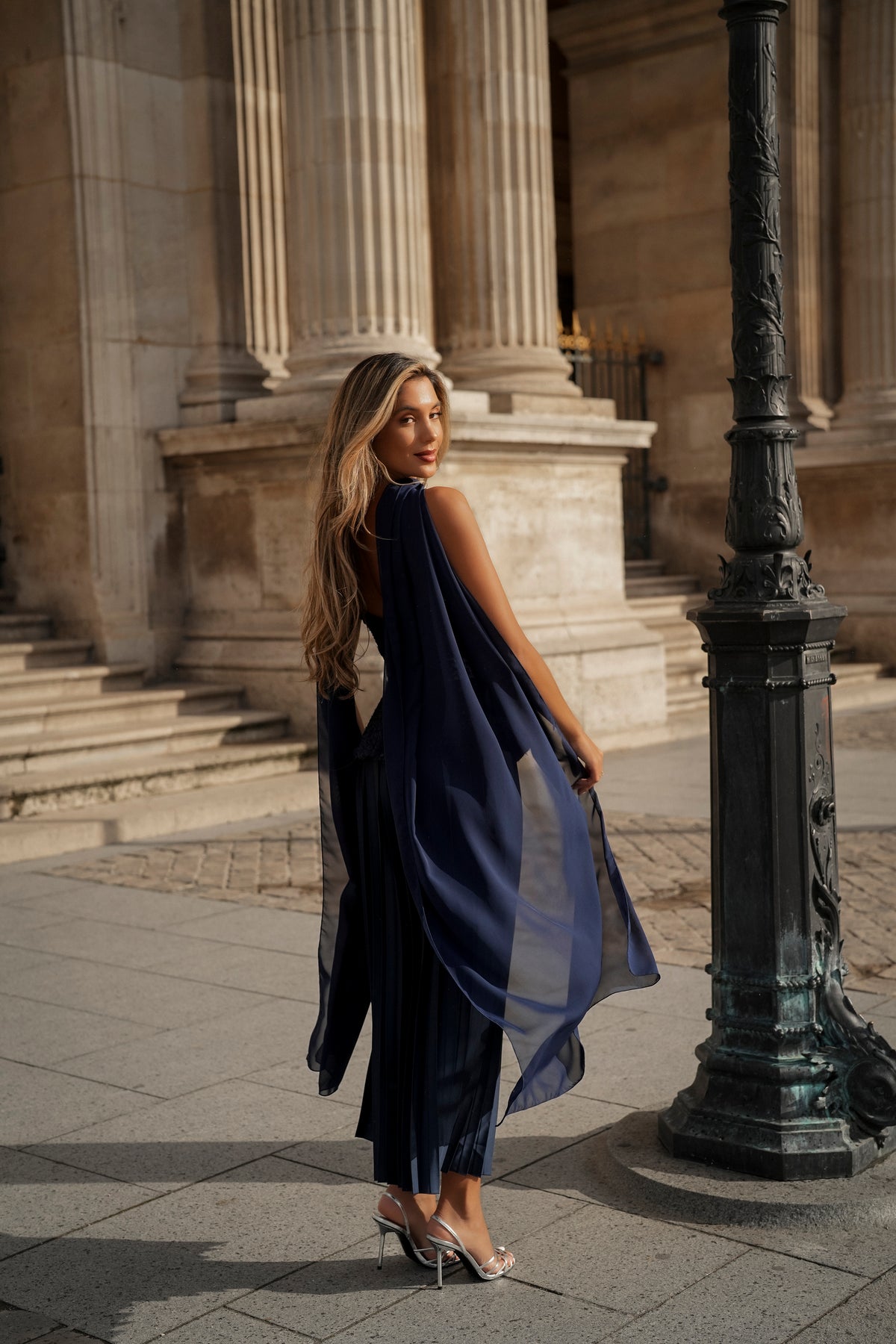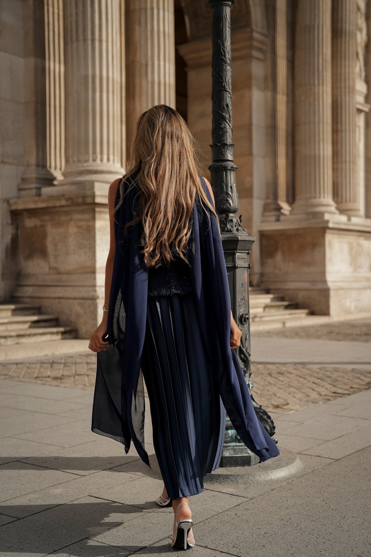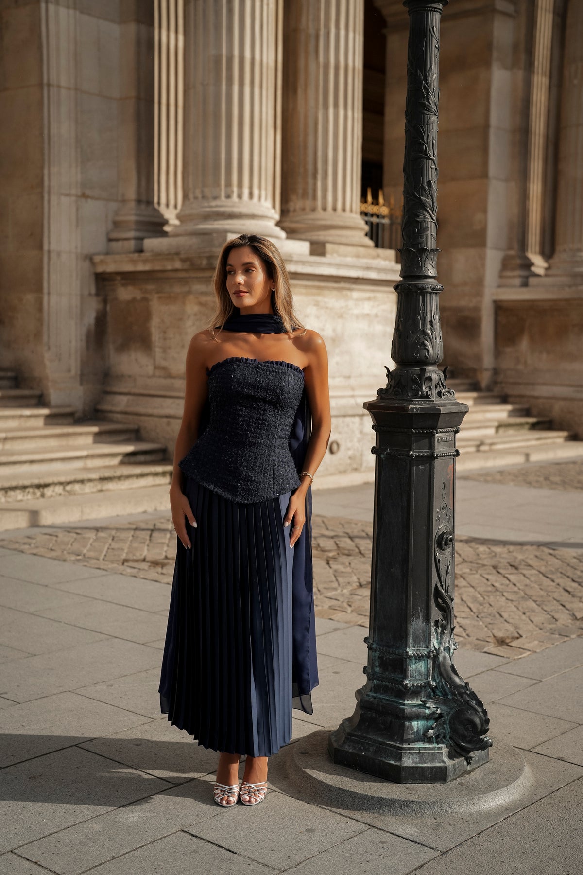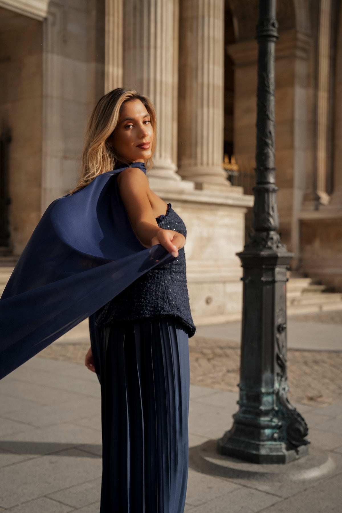 A two-piece set that combines the structure of a textured fitted top with the fluidity of a pleated skirt. The harmony between the two pieces creates a sophisticated and contemporary look, designed to shine at special events with a feminine and delicate touch, like a flower in motion.
