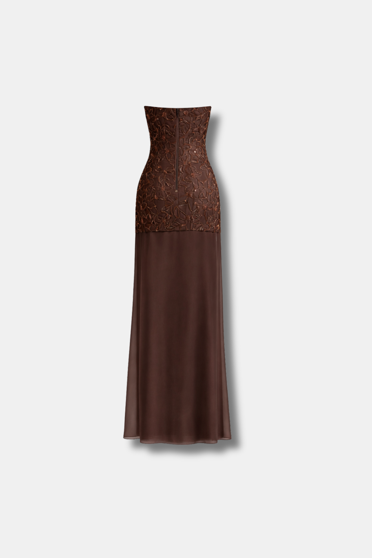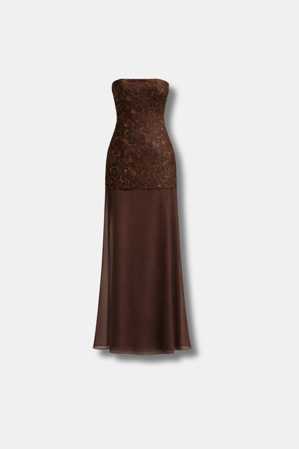 Discover the elegant beauty of the ISABELLA DRESS. With a sheer chiffon skirt and a beaded floral top, this strapless dress hugs your silhouette with its slight stretch. Complete your look with the included shawl. Sophisticated and exclusive.