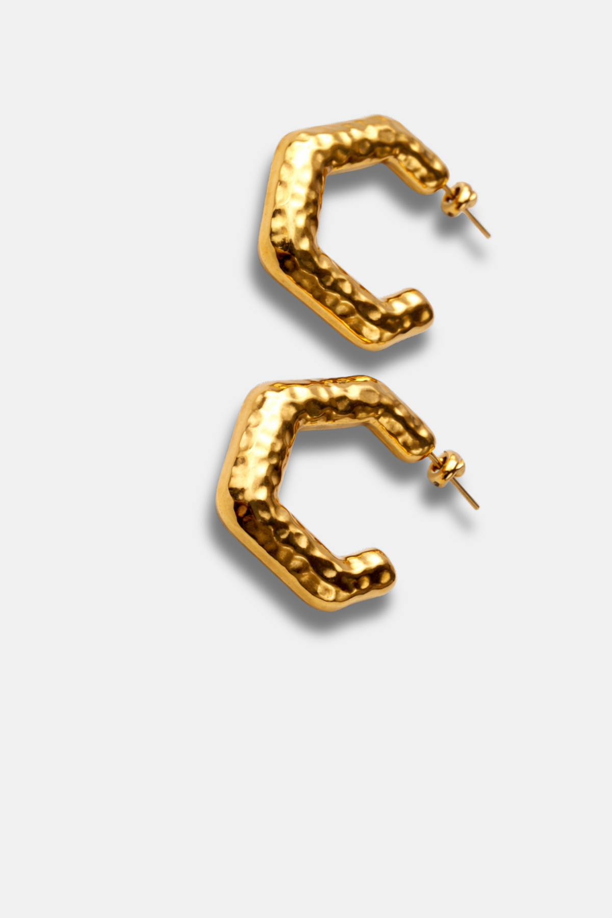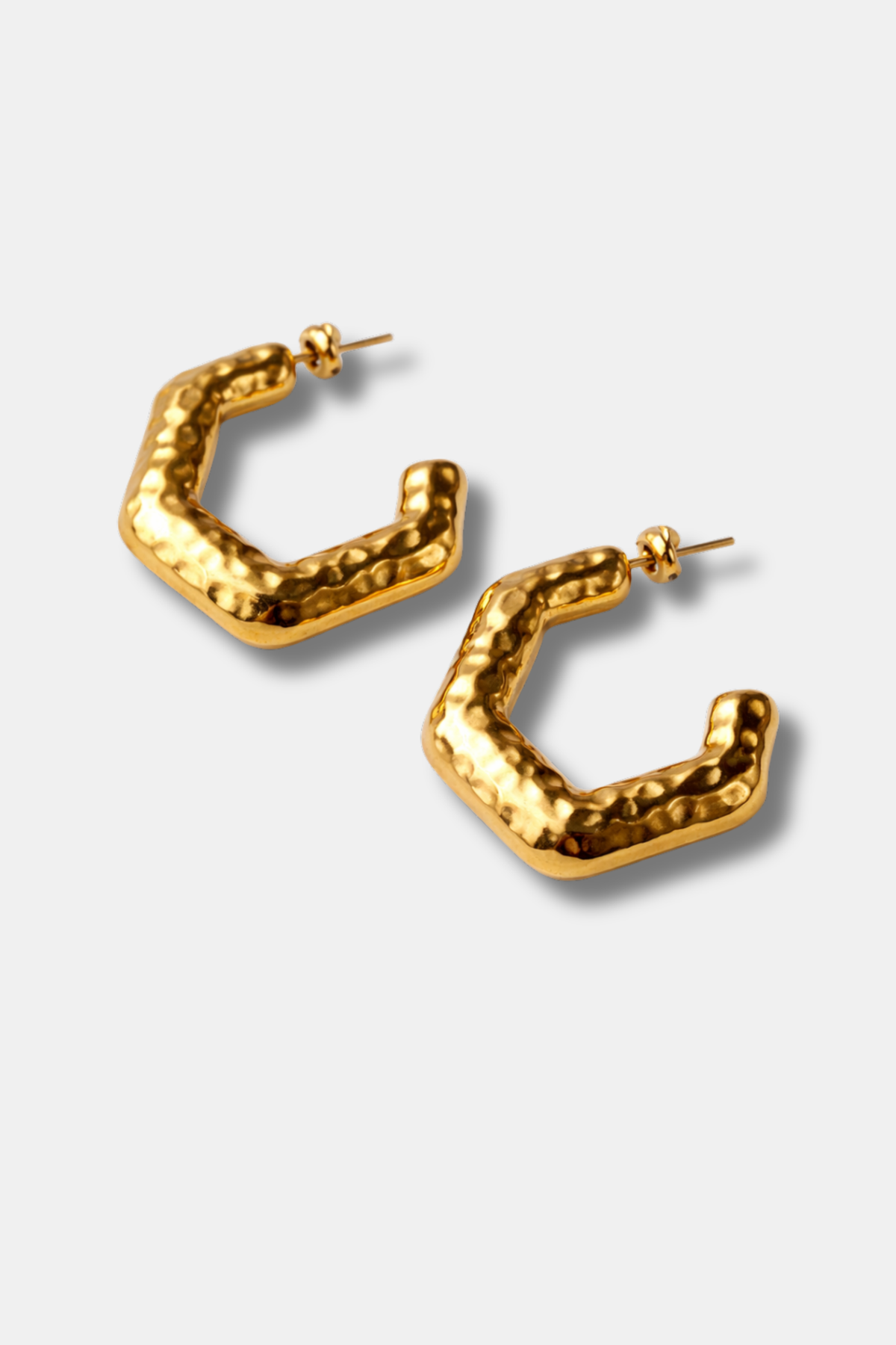 La forme hexagonale de ces boucles d'oreilles leur confère une allure moderne et architecturale, tandis que leur surface irrégulière reflète subtilement la lumière, créant un effet élégant et artisanal. Elles sont conçues pour sublimer toutes les tenues, des plus minimalistes aux plus sophistiquées.