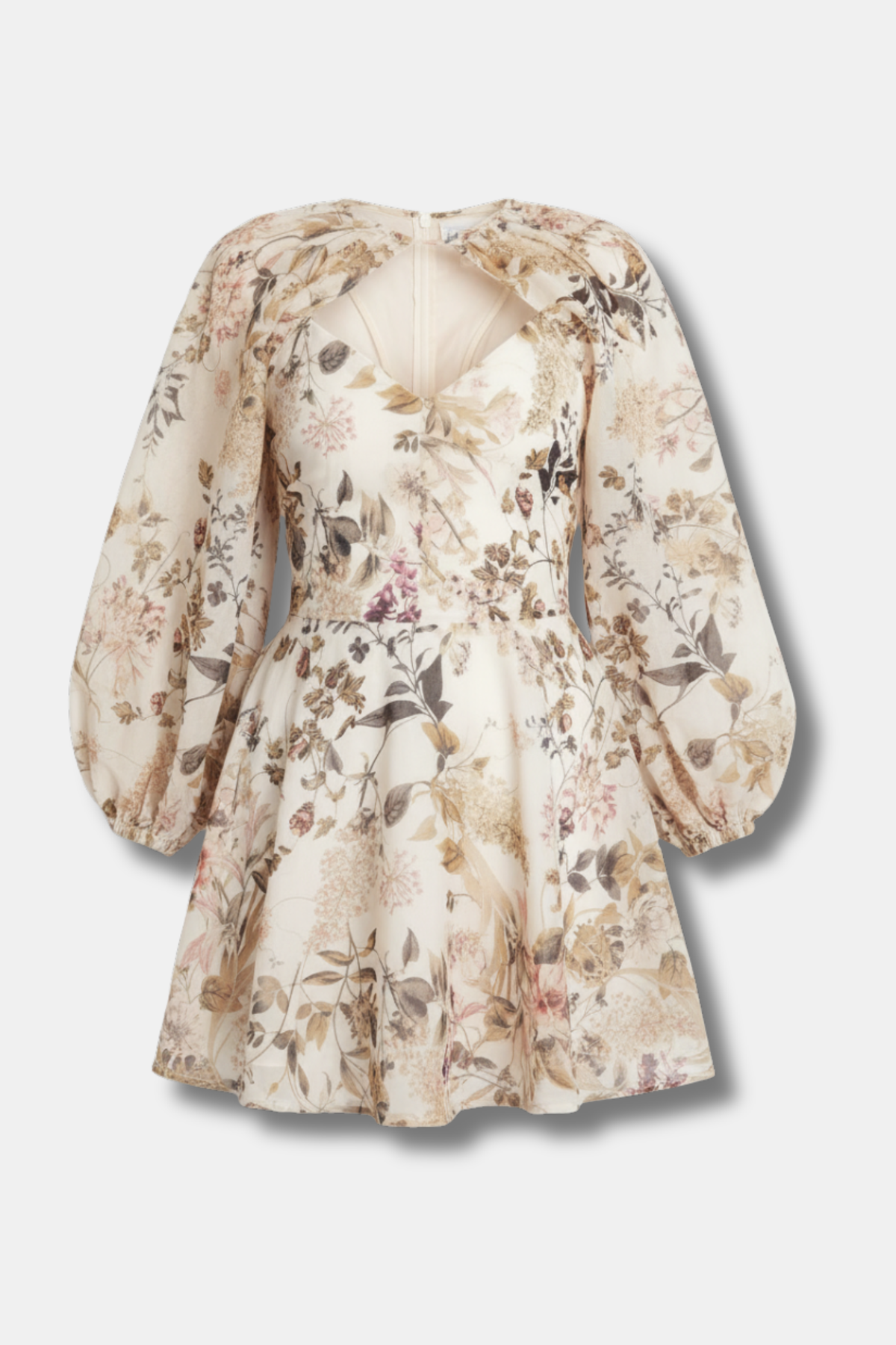 Robe courte évasée, entièrement doublée, manches longues, ouverture sur le décolleté, fermeture éclair dans le dos, dos nu.