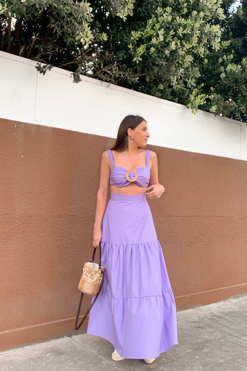 Falda larga de tejido en color lavanda, cortes con volantes, cierre de cremallera lateral
