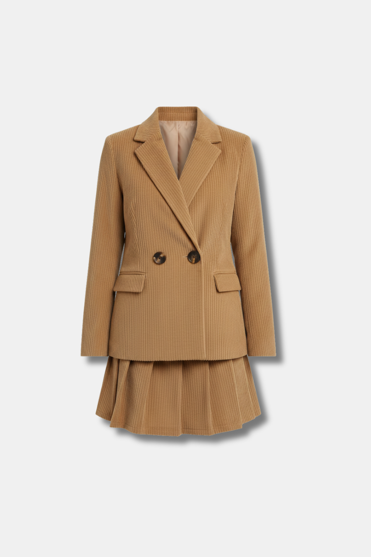 Conjunto de bombazine que combina elegância e versatilidade. Composto por um blazer estruturado e uma saia curta plissada, ambos em suave cotelê. Perfeito para criar looks sofisticados tanto em ocasiões especiais como no dia a dia. A textura característica do cotelê acrescenta calor e movimento, enquanto o corte impecável garante um ajuste favorecedor. Uma proposta de moda consciente que transcende tendências.