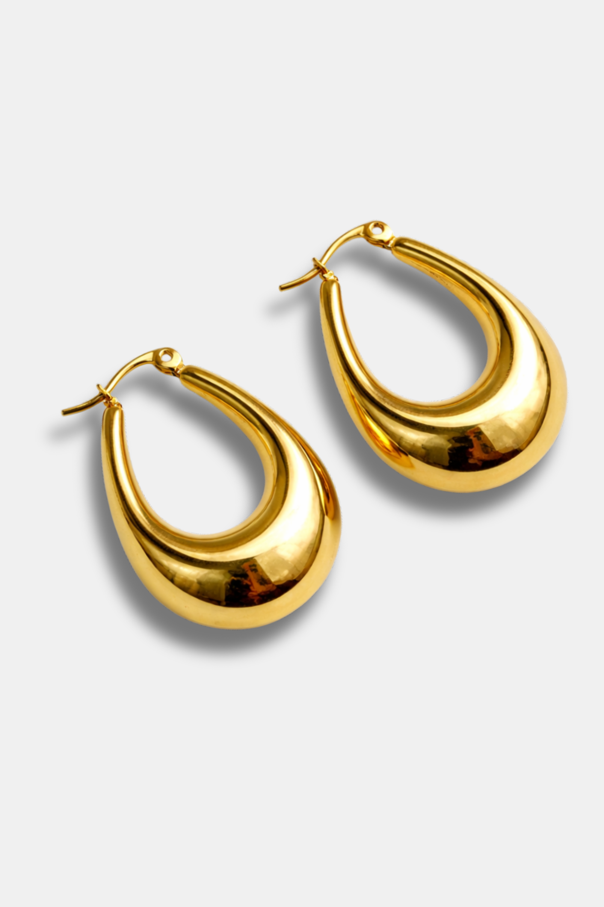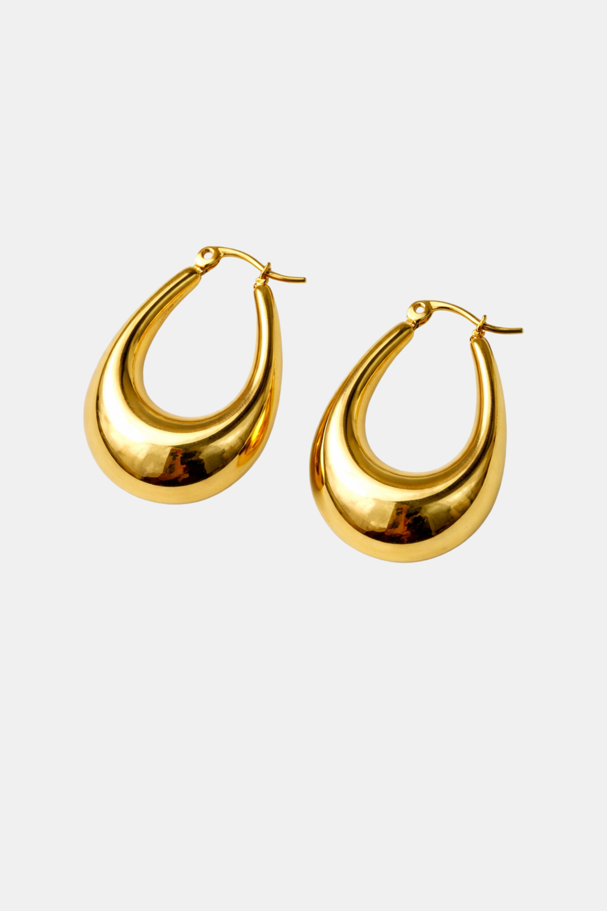 Estes brincos dourados em forma de gota destacam-se pelo seu design fluido e volumoso, que envolve o rosto com suavidade e sofisticação. A sua silhueta arredondada e polida confere um brilho espelhado muito favorecedor, tornando-os numa peça elegante e fácil de combinar.
