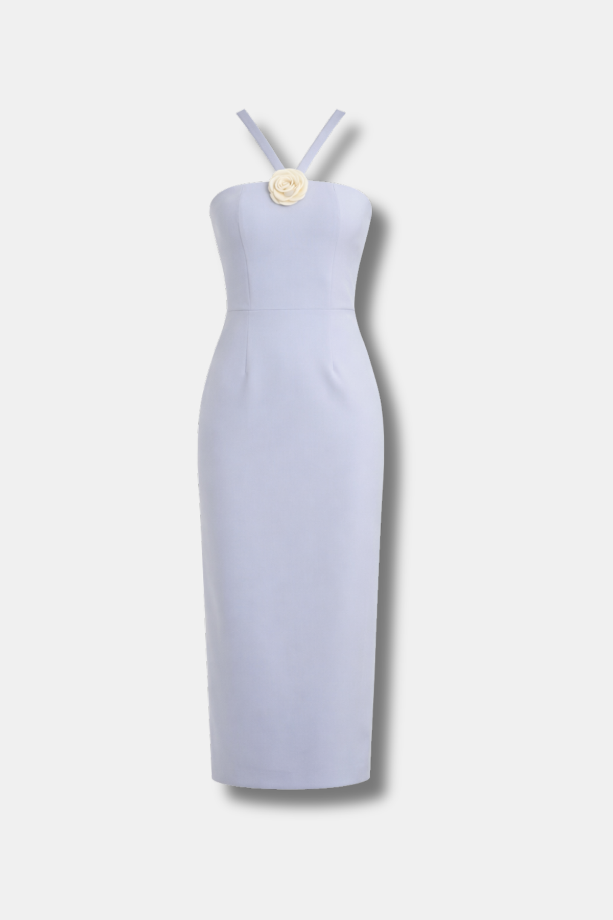 O vestido Elenza é inspirado na beleza do céu e das flores brancas. Com corte lápis e fecho nas costas, é perfeito para realçar a silhueta. A parte de cima é forrada com o mesmo tecido, enquanto a saia tem forro. Possui um decote halter com uma flor de cetim bege no meio.